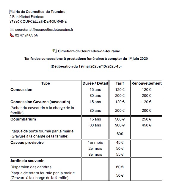 Tarifs en annexe du règlement de cimetière.
